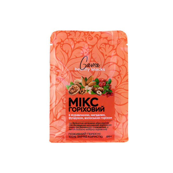 Горіховий мікс з журавлиною від Гавра — це вдале поєднання ніжної ягідної кислинки й поживного горіхового хрумту. У складі: сушена журавлина, волоський горіх, фундук і мигдаль — без доданого цукру, без консервантів, лише натуральні інгредієнти.